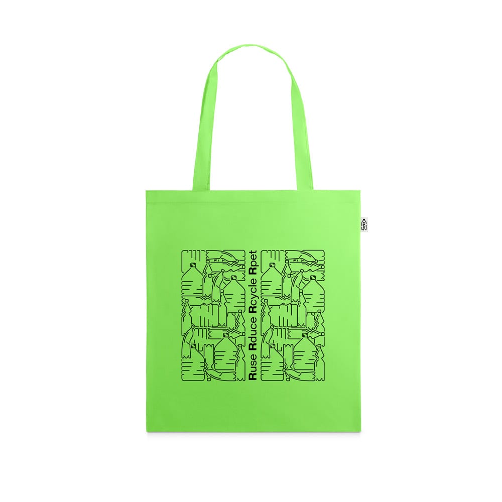 Sacola 100% poliéster reciclado 190T (100% rPET). Produzida a partir de plástico reciclado contribuindo para a redução dos resíduos no meio ambiente. Alças de 55 cm. 380 x 420 mm