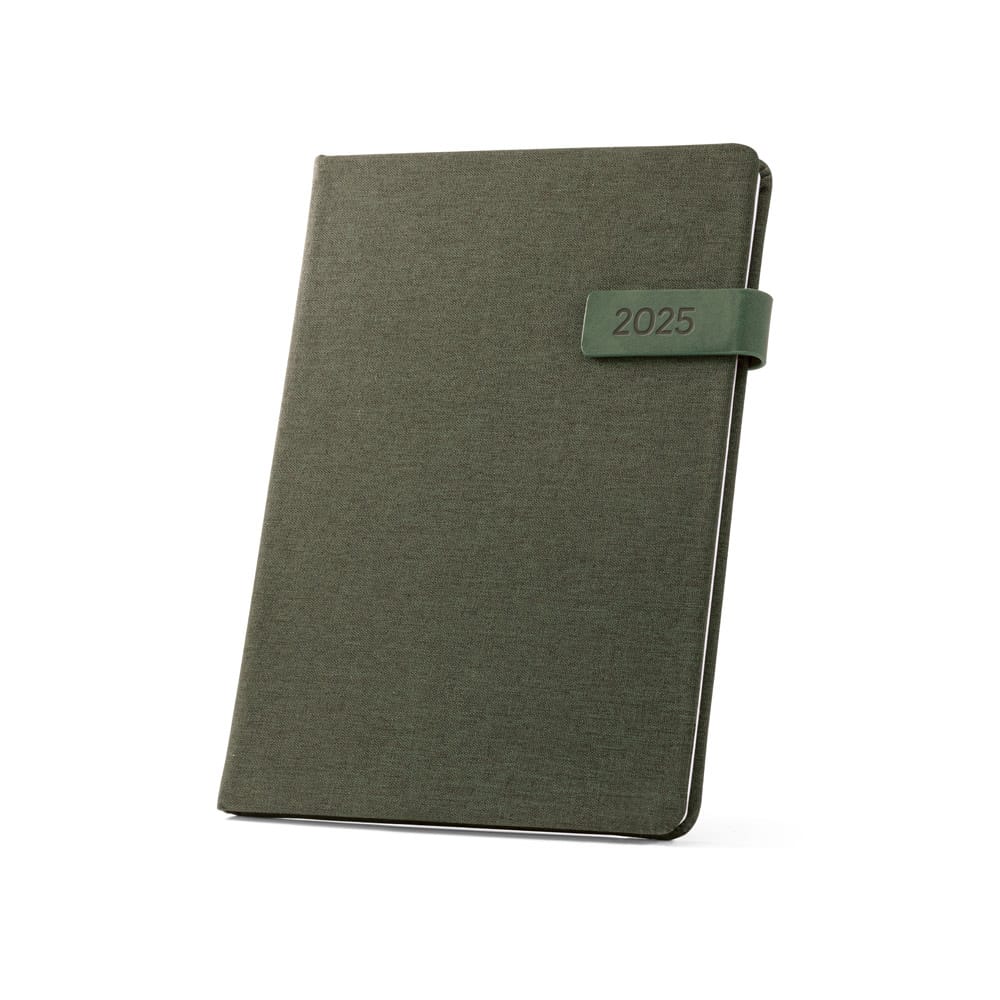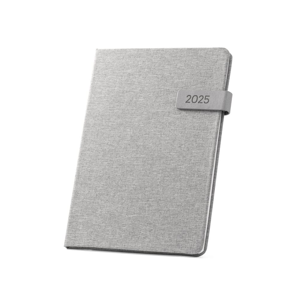 Agenda B5 em PET (100% rPET). Agenda com fecho magnético em PU, marcador em fita e suporte para esferográfica (não inclusa). Está organizada num plano semanal. Fornecida com bolsa de non-woven. 175 x 245 mm | Bolsa: 220 x 270 mm
