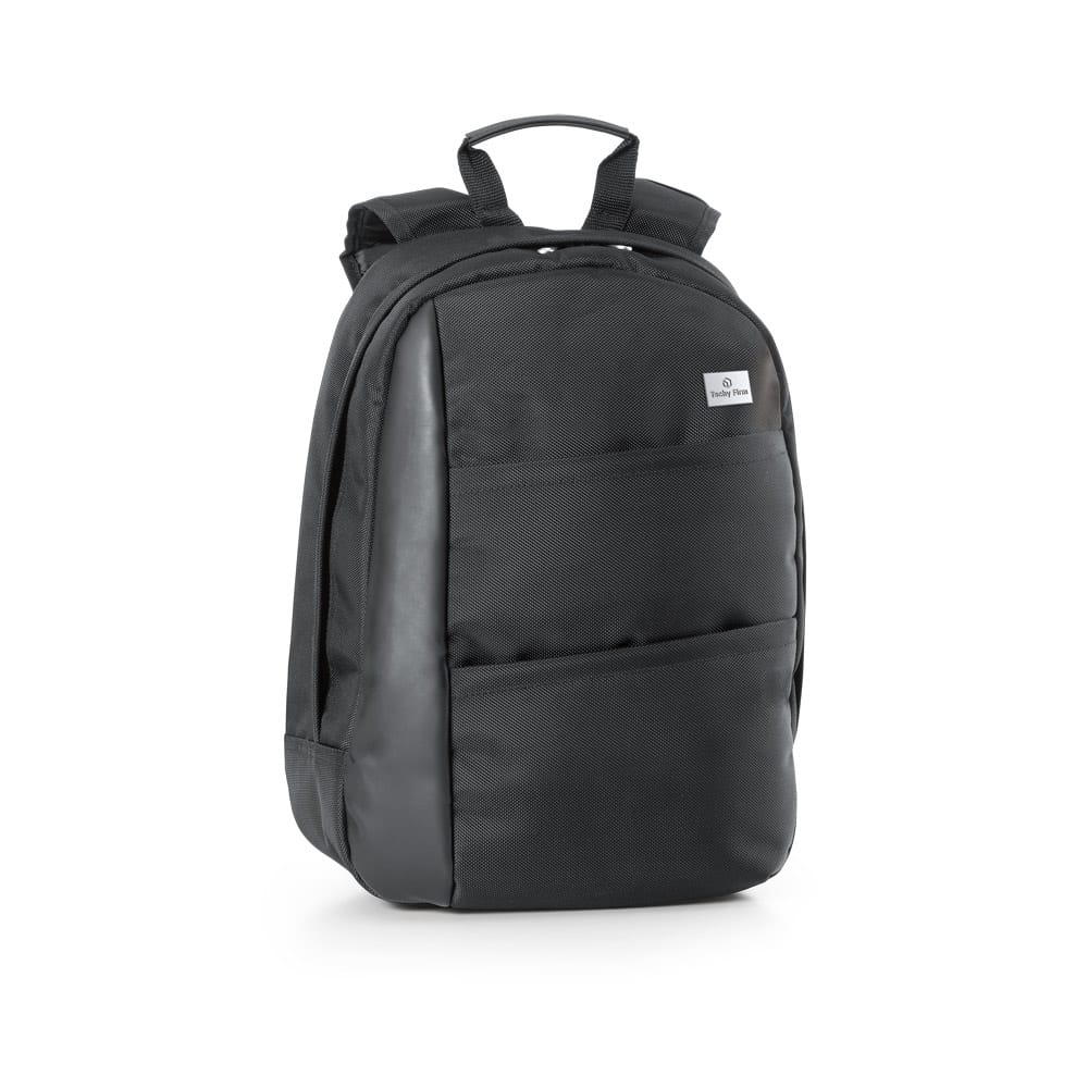 Mochila para notebook em 1680D e c. sintético. Compartimento com divisória almofadada para notebook até 15.6''. Interior forrado e almofadado. Contém diversos bolsos interiores. A mochila tem 2 bolsos frontais e placa metálica personalizável. A parte posterior é almofadada e tem sistema de apoio acolchoado para as costas e alças almofadadas. Capacidade até 17 L. 340 x 450 x 130 mm | Placa: 40 x 20 mm