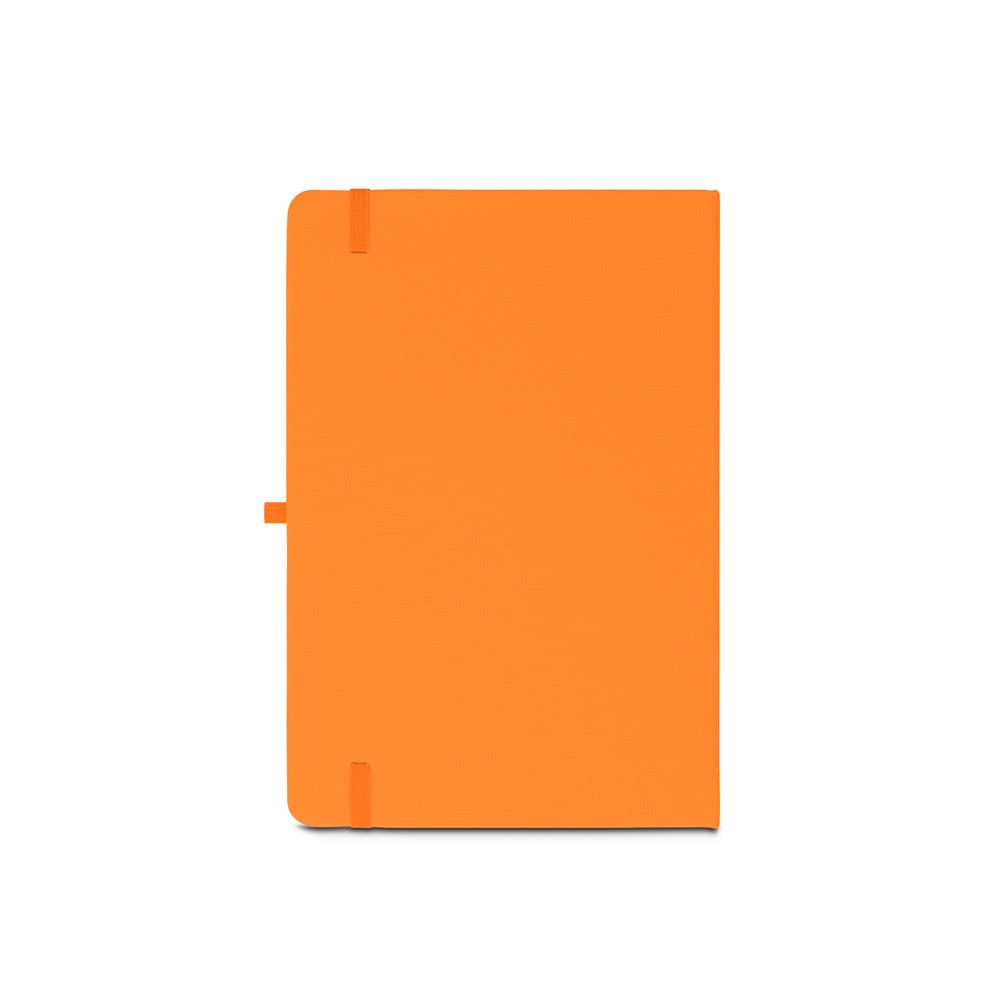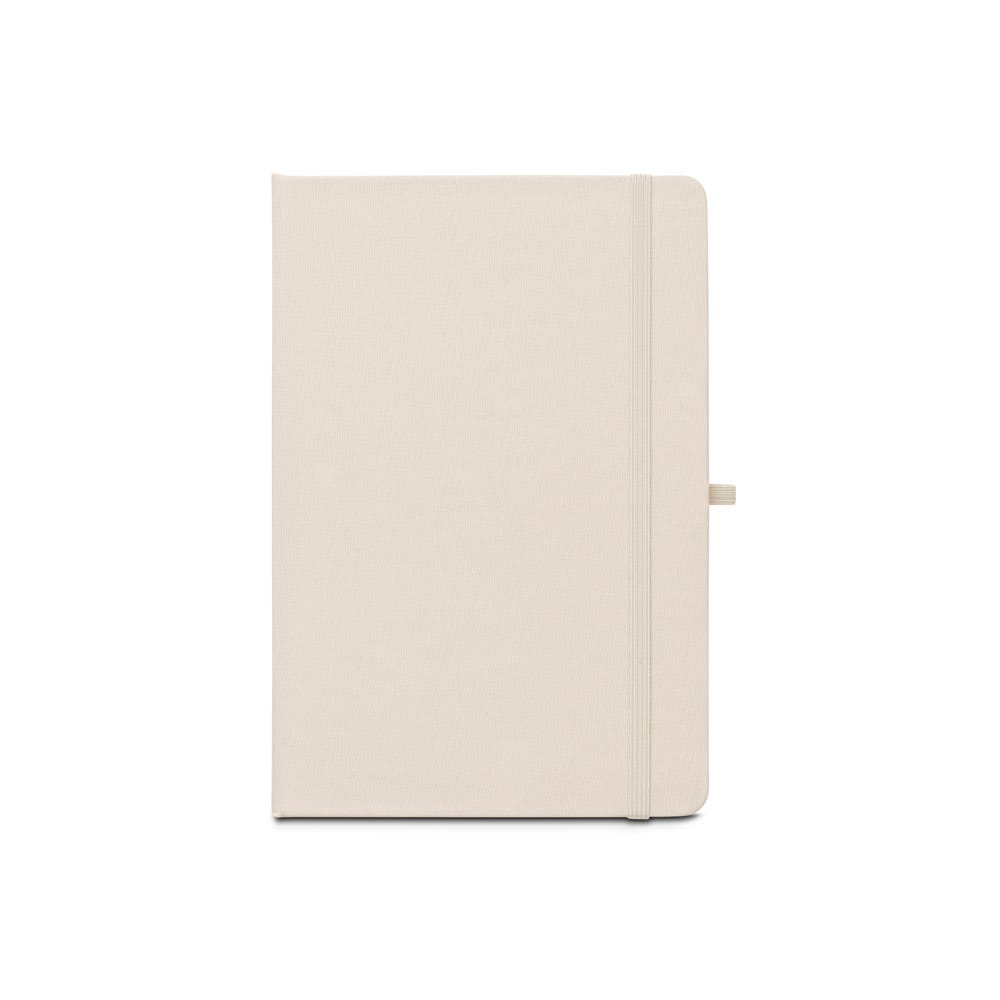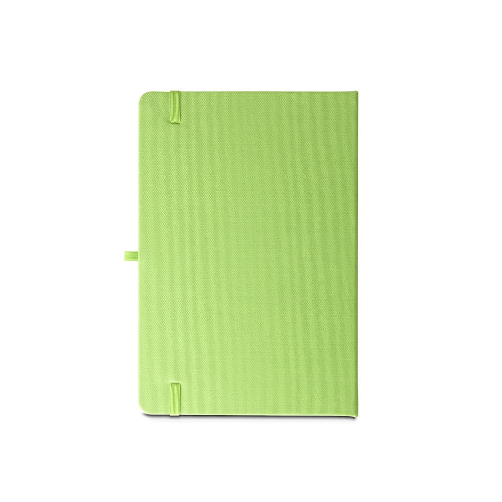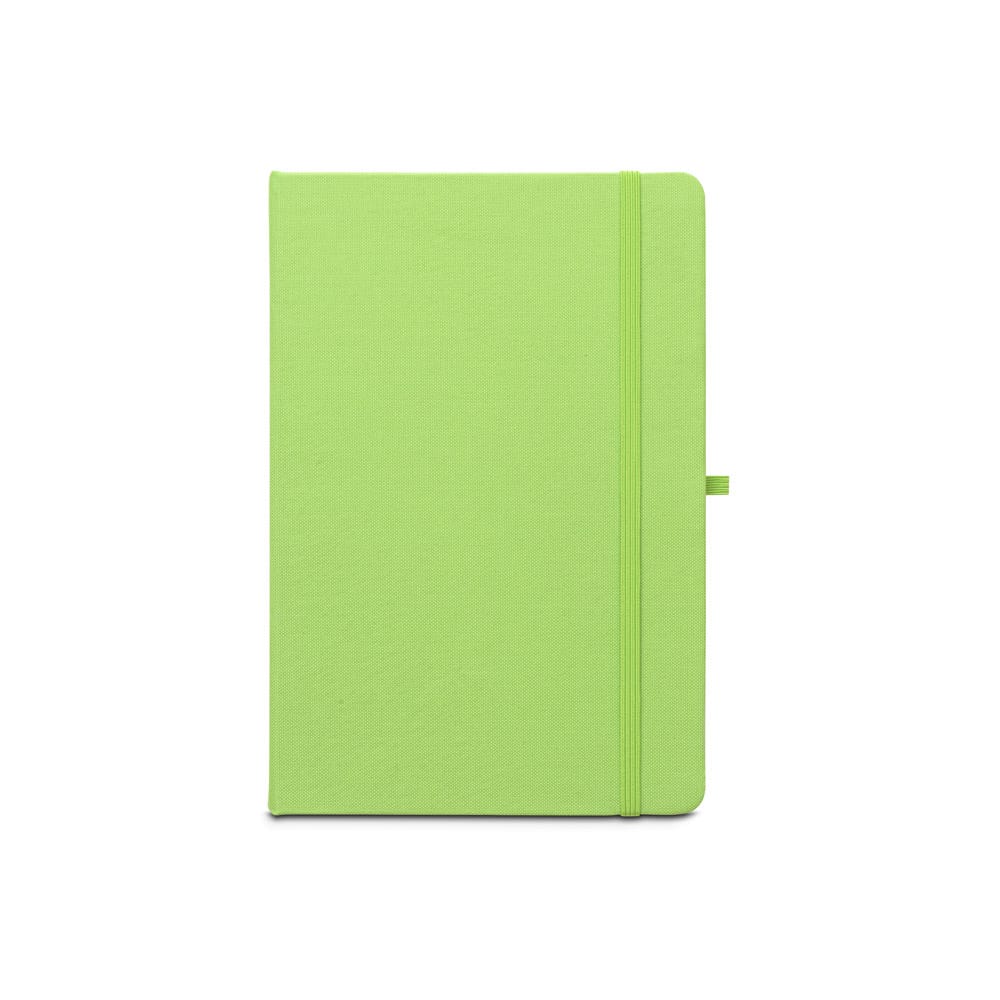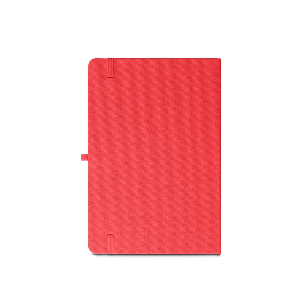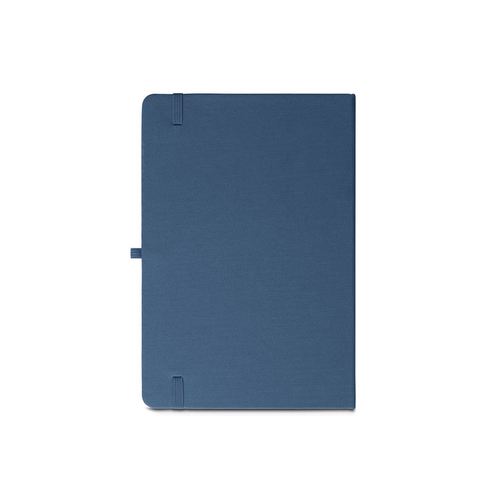 Caderno A5 de capa dura em poliéster 100% reciclado (100% rPET) com cantos redondos. Contém 80 folhas pautadas em papel cor de marfim reciclado, fita separadora, suporte para esferográfica (não inclusa) e elástico para fecho do caderno. Na parte inferior da lombada, tem impresso em branco o símbolo do rPET. 143 x 211 mm