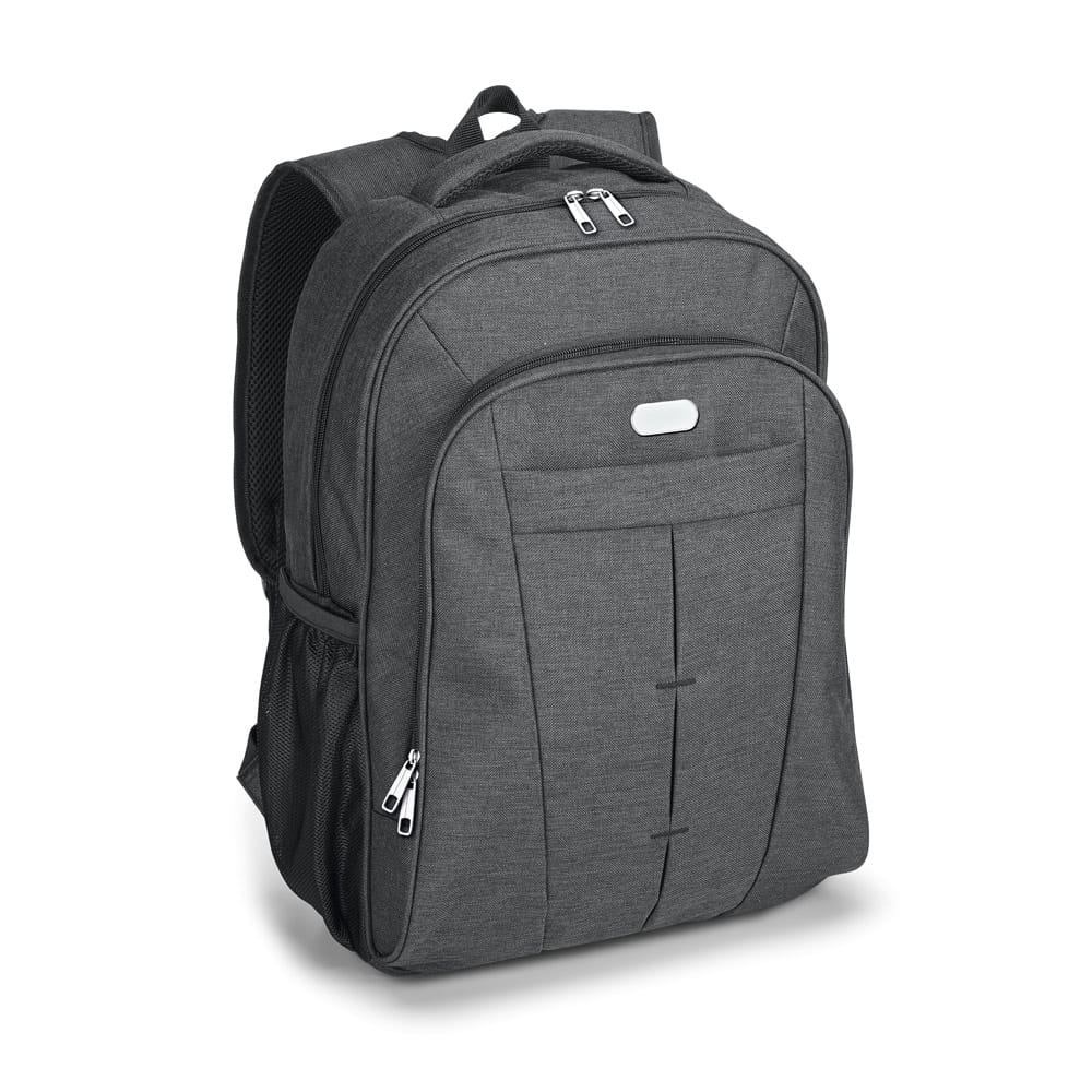 Mochila para notebook em 600D de alta densidade com compartimento forrado, com divisória almofadada para notebook até 17'' e diversos bolsos interiores. 2 bolsos laterais em tela mesh e 2 bolsos frontais. Parte posterior almofadada, com sistema de apoio acolchoado para as costas e alças almofadadas. Placa metálica removível com imã, para fácil gravação. Capacidade até 24 L. 340 x 450 x 175 mm | Placa: 50 x 20 mm