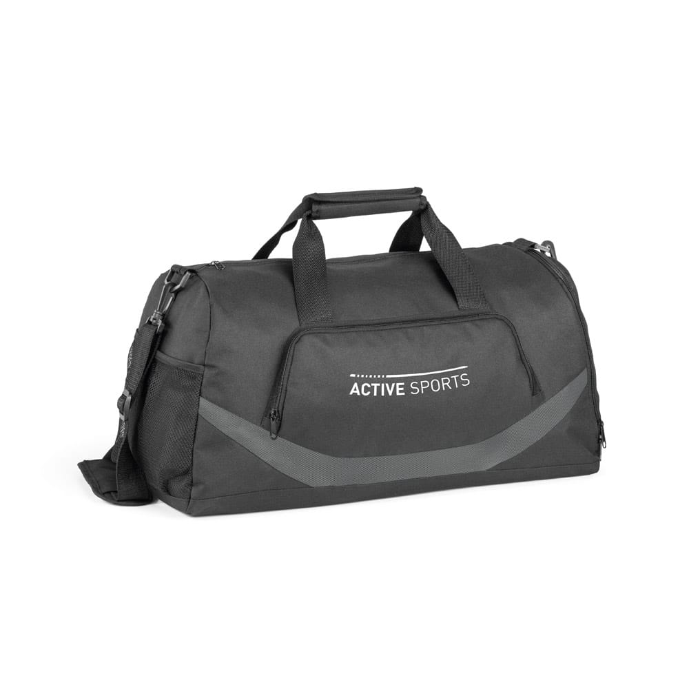 Bolsa esportiva em 300D e 1680D com fundo em placa semi-rígida. Contém um bolso frontal com zíper, um bolso lateral em tela mesh e um bolso lateral para sapatos. Alça de ombro ajustável, com reforço almofadado. Capacidade até 35 L. 570 x 330 x 300 mm
