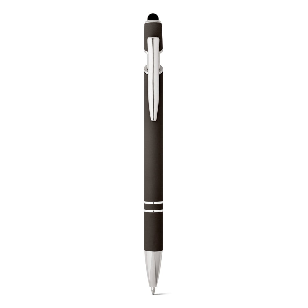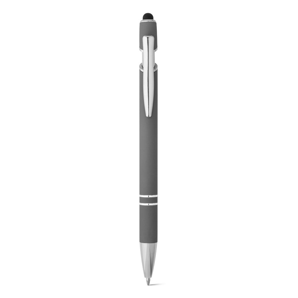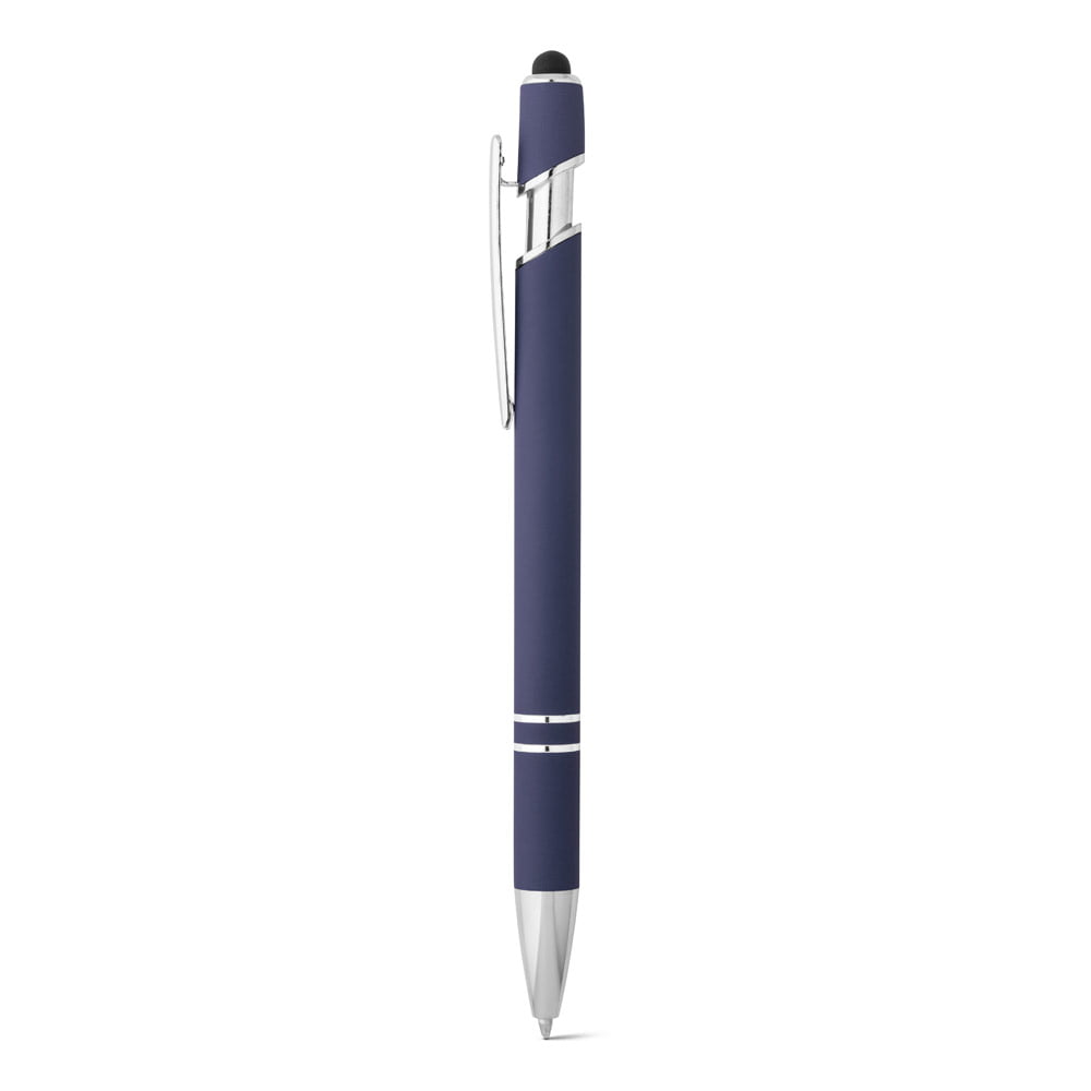 Esferográfica em alumínio com acabamento emborrachado. A esferográfica tem escrita em azul, ponteira touch no topo da esferográfica e clipe de metal. ø10 x 143 mm