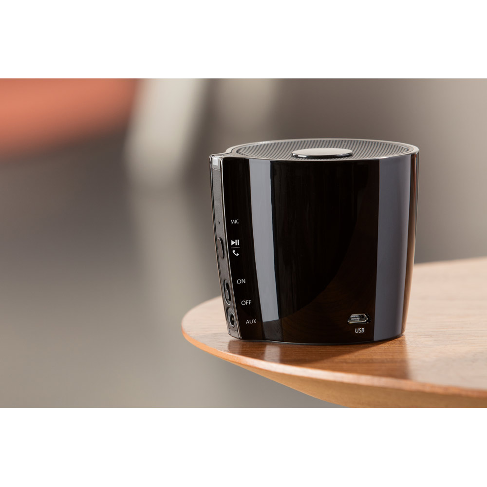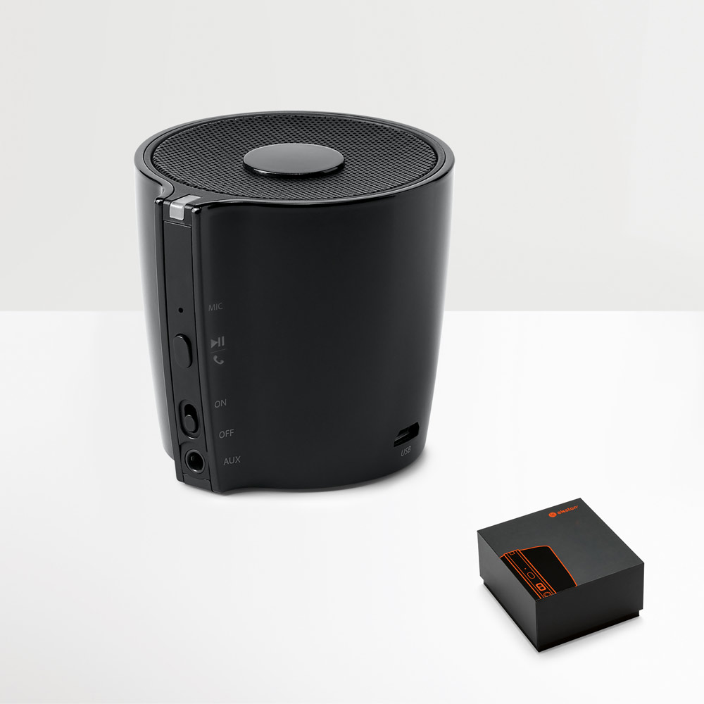 A BLARE é uma caixa de som com microfone de design moderno e discreto em ABS. A caixa é um objeto que se torna um parceiro para todos os momentos devido às suas características técnicas e funcionais como botão para atender chamadas e conexão à playlist do dispositivo móvel. A BLARE tem transmissão sem fios BT v5.0, alcance até 10 m e frequência de 90Hz-20kHz. A sua capacidade é de 500 mAh, 3W/4Ω e tem autonomia aproximada de 6 h. Incluso cabo para carregar e entrada AUX para Jack 3,5mm. Fornecida em caixa presente. 60 x 63 x 70 mm | Caixa: 120 x 139 x 83 mm