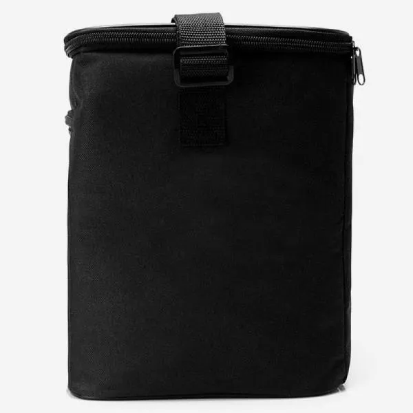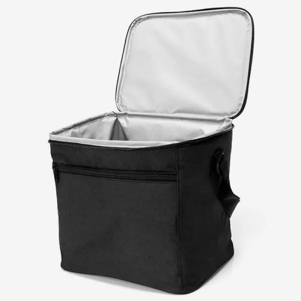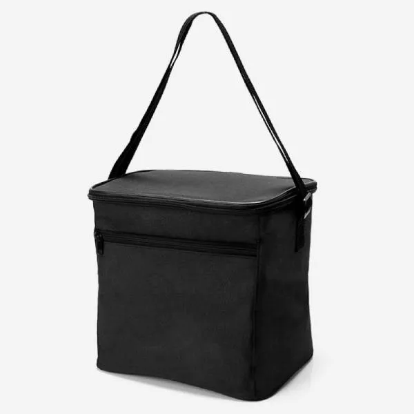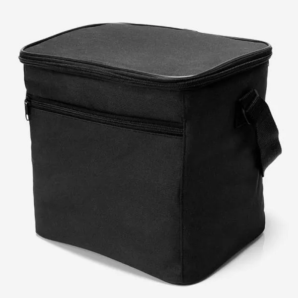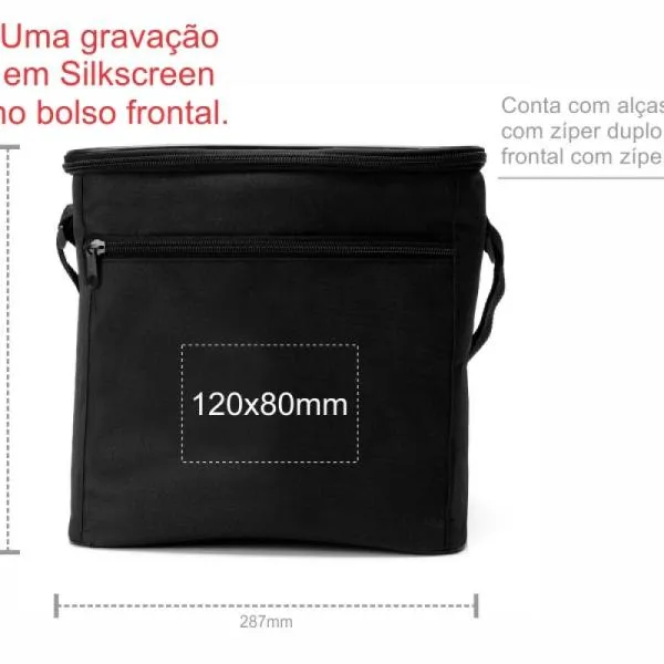 Bolsa Térmica preta em Polyester 600D, 300D e PEVA. Conta com alças de mão, tampa com zíper duplo cursor e bolso frontal com zíper. Tempo de Conservação aproximado: Frio 10 horas / Quente 3 horas.