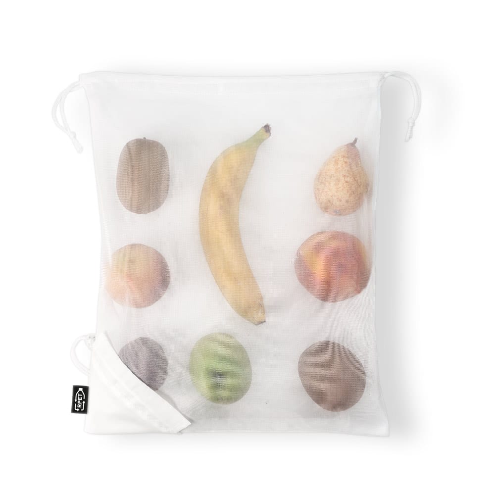 Sacola dobrável 100% rPET, malha 100% poliéster reciclado com bolso em 100% poliéster reciclado 190T para dobrar a sacola, sendo ideal para as compras. Fornecida desdobrada. 320 x 400 mm