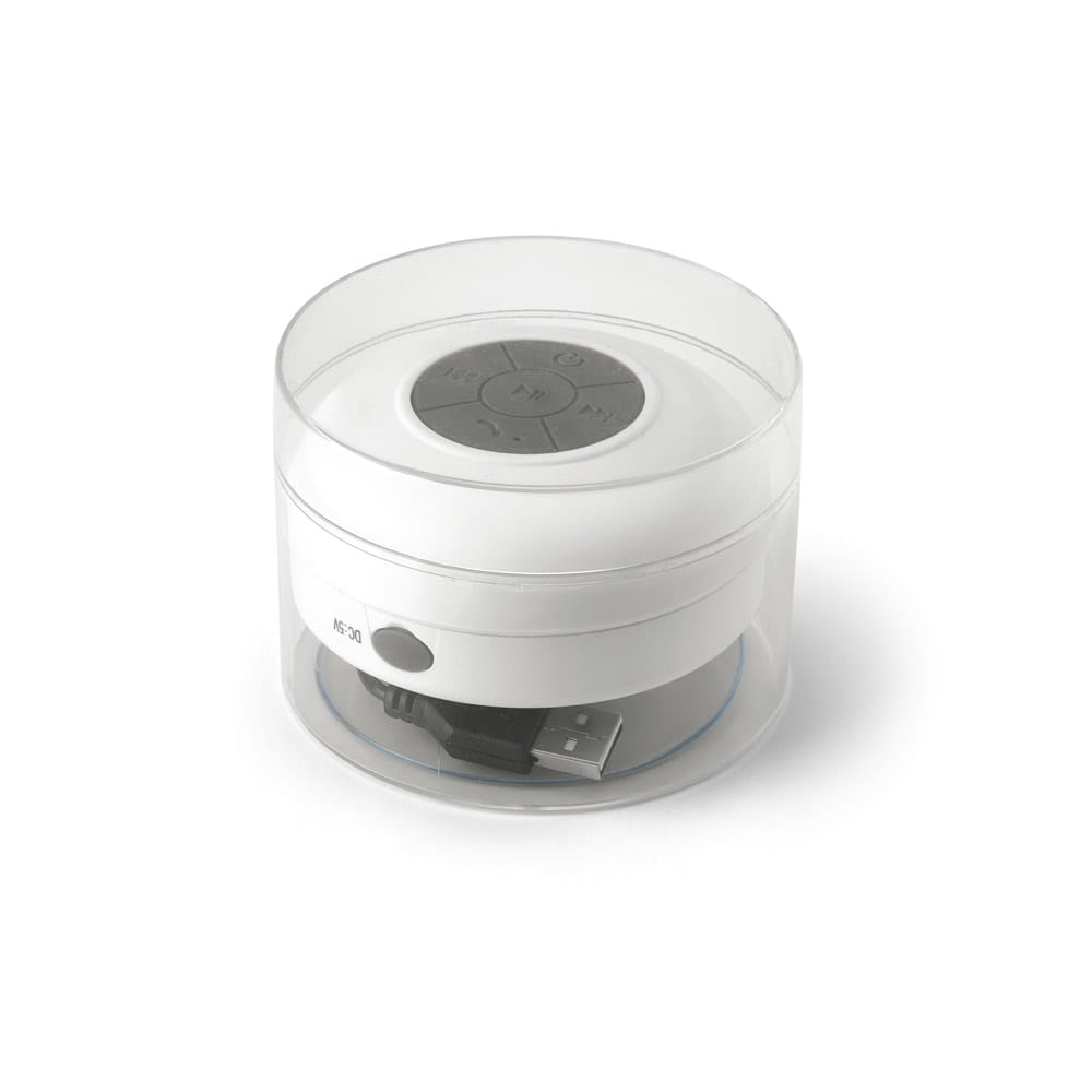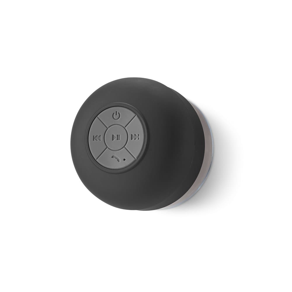 Caixa de som, com microfone, à prova de água em ABS com acabamento emborrachado com ventosa. transmissão sem fios BT v5.0 e potência de 3W/4Ω. Autonomia aproximada de 3 h. Função para atender chamadas, controle de volume e conexão à playlist do dispositivo móvel. Incluso cabo para carregamento. Fornecida em caixa presente. ø85 x 50 mm | Caixa: 88 x 88 x 55 mm