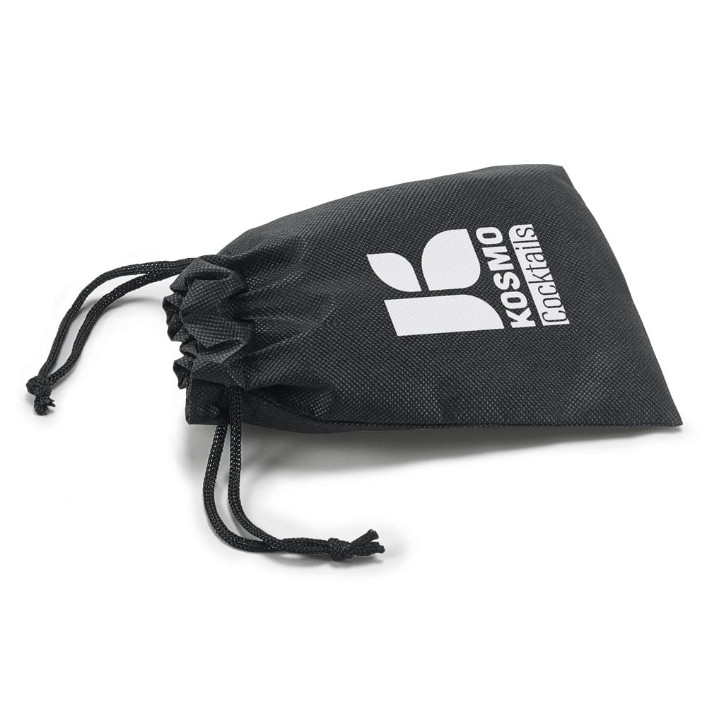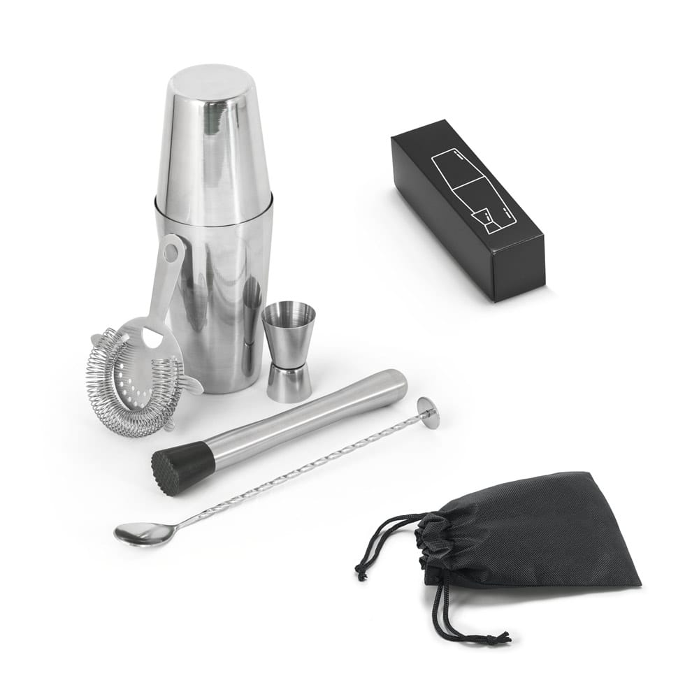 Set de cocktail com 6 peças em aço inox: um shaker (600 + 450 mL), um copo dosador (30 mL), uma colher, um pilão e um coador. Inclusa uma bolsa em non-woven. Fornecido em caixa presente. Certificação EU Food Grade. Caixa: 98 x 98 x 290 mm