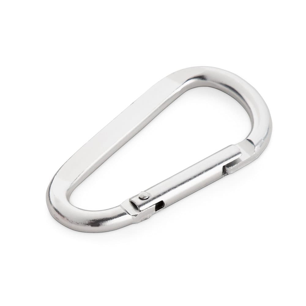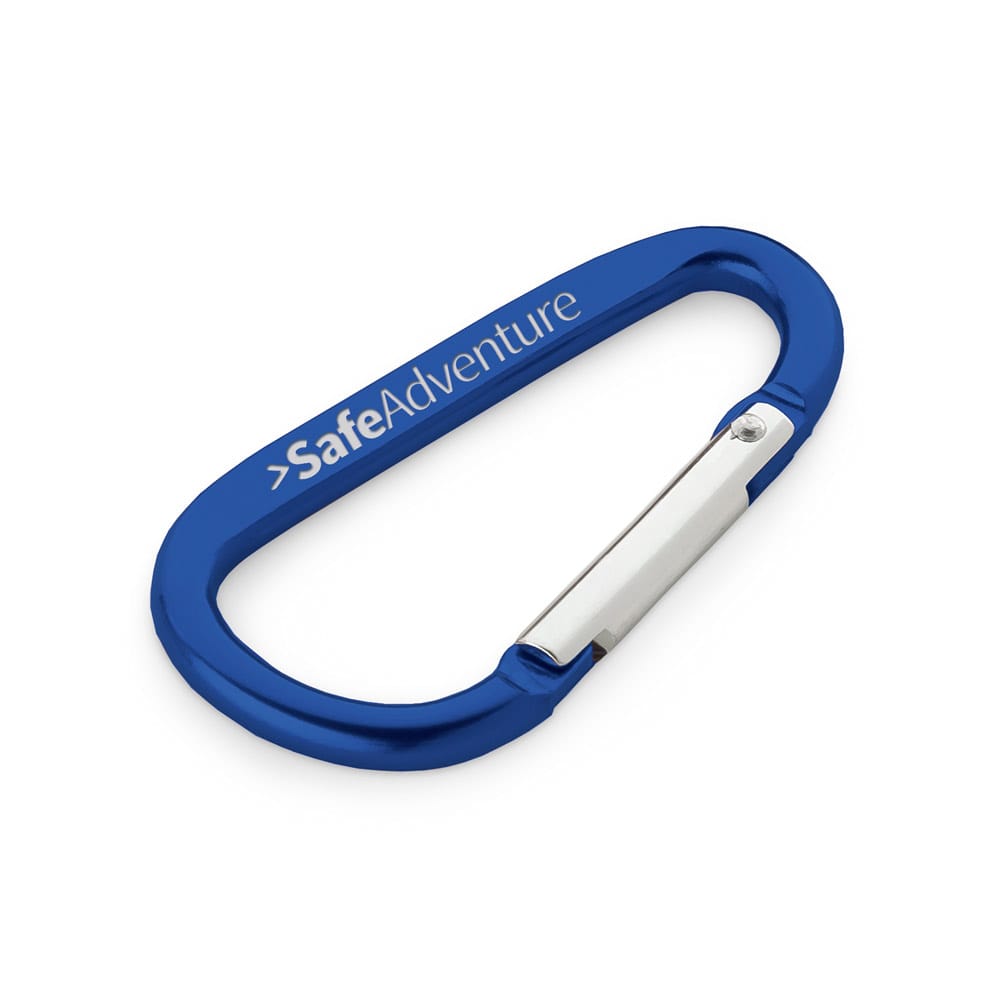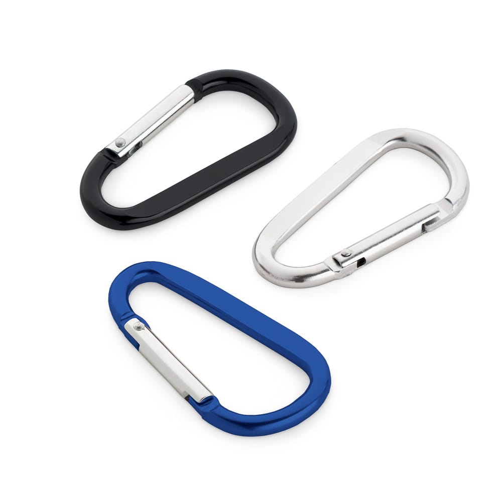 Mosquetão em alumínio com área plana para gravação. 32 x 57 x 5 mm