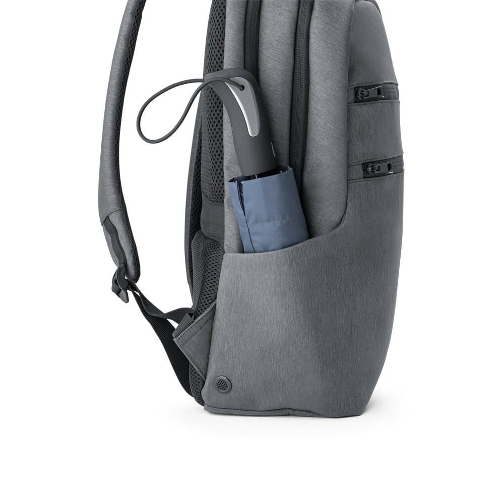 Mochila para notebook em Nylon 2Tone impermeável com 2 compartimentos e alças almofadadas. O compartimento posterior tem 2 divisórias almofadadas com fecho em velcro para notebook até 15'' e tablet até 10.5''. Compartimento frontal com diversos bolsos interiores. Contém dois bolsos na parte frontal, tendo um deles bloqueio RFID. Nas laterais existe um bolso para garrafas em elastano e outro para o guarda-chuva, com ilhós perfurados para evitar acumulação de água. A parte de trás almofadada tem bolso oculto e banda para transporte em trolley. Capacidade até 14 L. 320 x 450 x 140 mm
