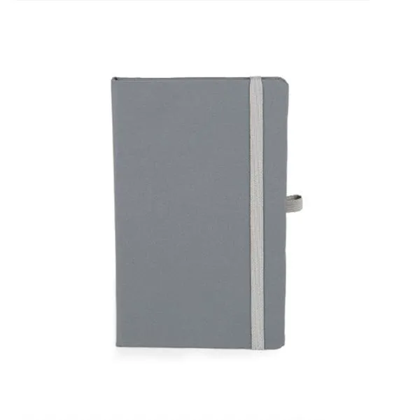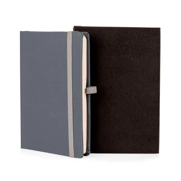 Caderno para anotações cinza com capa dura. Conta com 80 folhas pautadas, marcador de página, porta caneta e elástico para fechamento. Gramatura da folha de 70 g/m2.