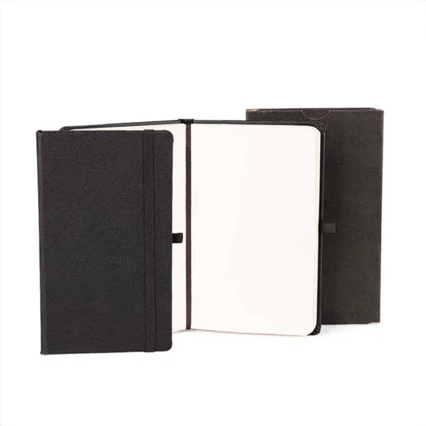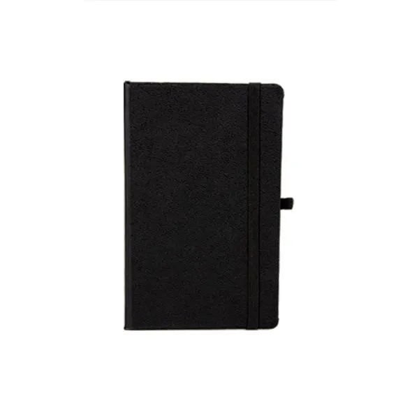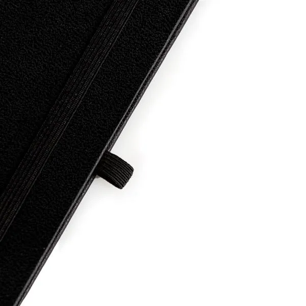Caderno para anotações preto com capa dura. Conta com 80 folhas pautadas, marcador de página, porta caneta e elástico para fechamento. Gramatura da folha de 70 g/m2.