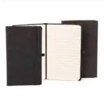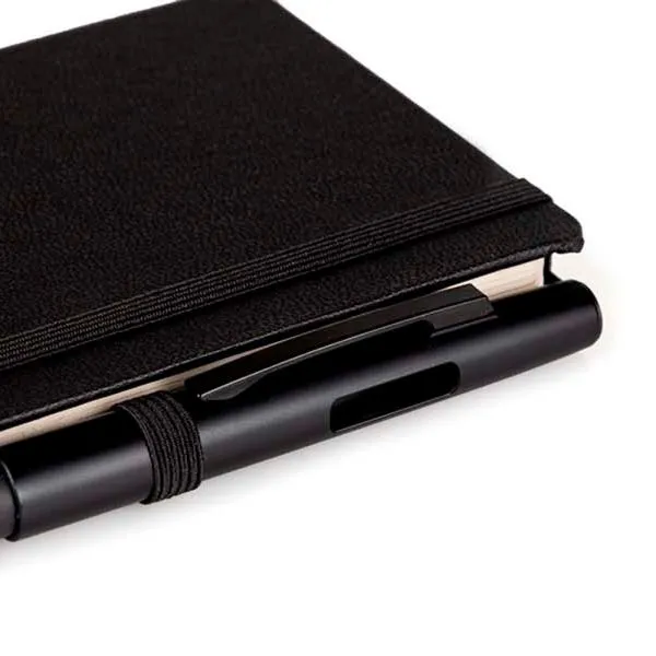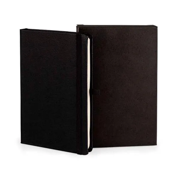 Caderno para anotações preto com capa dura. Conta com 80 folhas pautadas, marcador de página, porta caneta e elástico para fechamento. Gramatura da folha de 70 g/m2.