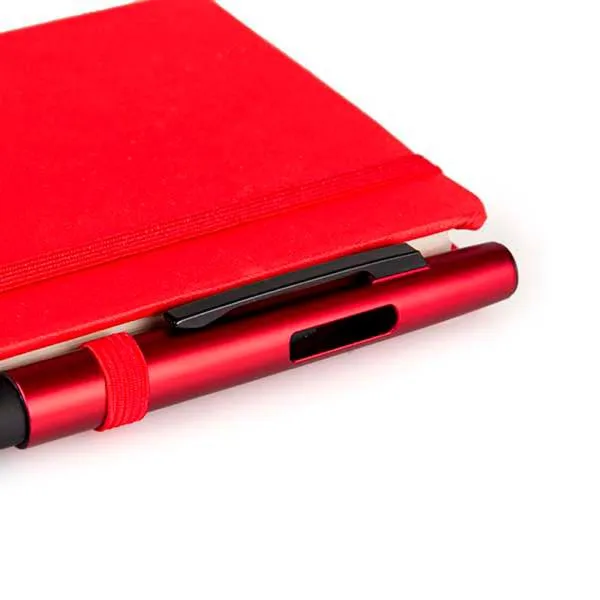 Caderno para anotações vermelho com capa dura. Conta com 80 folhas pautadas, marcador de página, porta caneta e elástico para fechamento. Gramatura da folha de 70 g/m2.