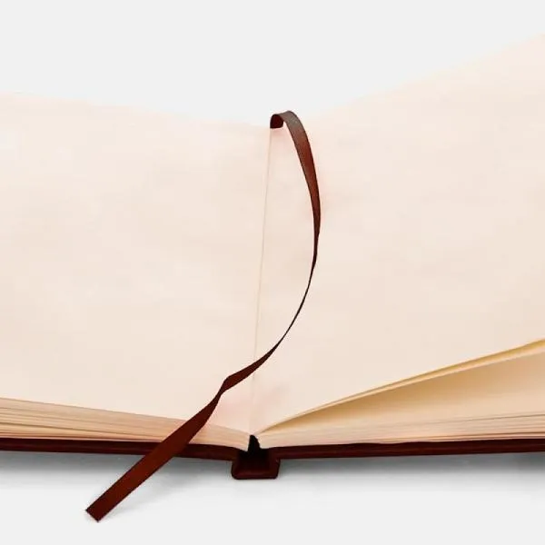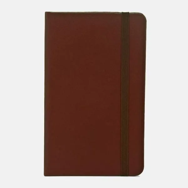Caderno para anotações marrom com capa dura em Courino. Conta com 80 folhas não pautadas e elástico para fechamento. Gramatura da folha de 70 g/m2.