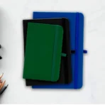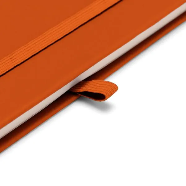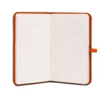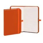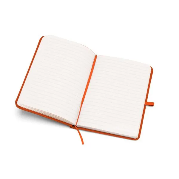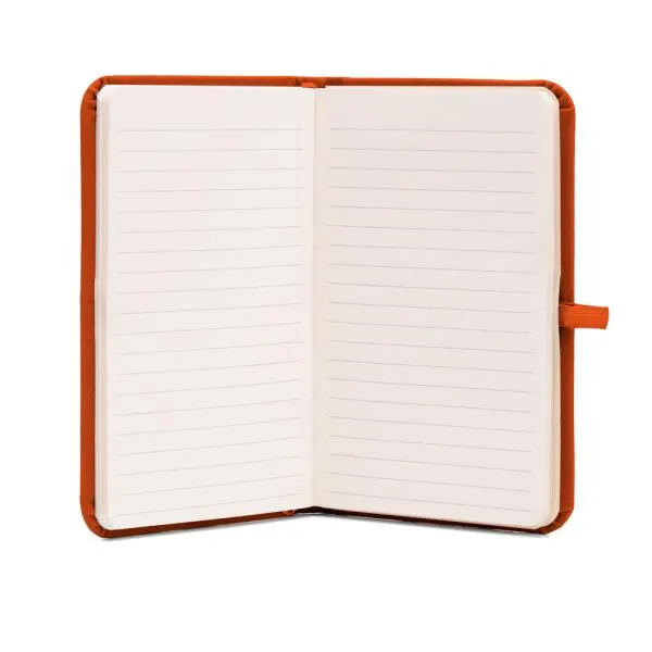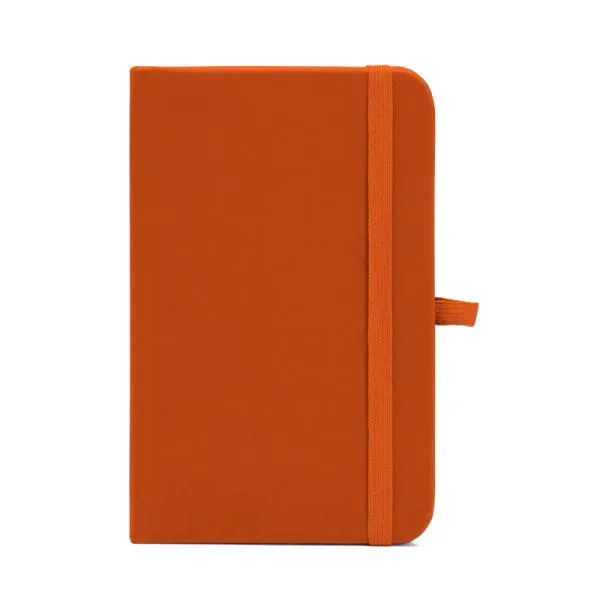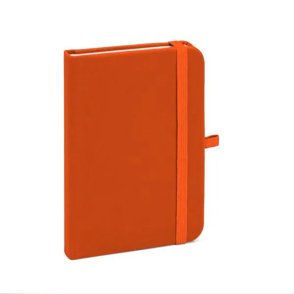 Caderno para anotações laranja com capa dura. Conta com 80 folhas pautadas, porta caneta e elástico para fechamento. Gramatura da folha de 70 g/m2 com 15x9 cm.