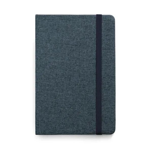 Caderno para anotações com capa dura revestida de Poliéster azul. Conta com 80 folhas pautadas, marca página e elástico para fechamento. Gramatura da folha de 70 g/m2