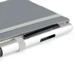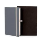 Caderno para anotações cinza com capa dura. Conta com 80 folhas não pautadas, marcador de página, porta caneta e elástico para fechamento. Gramatura da folha de 70 g/m2.