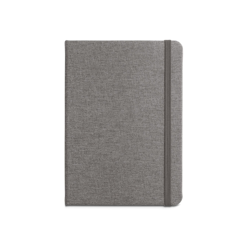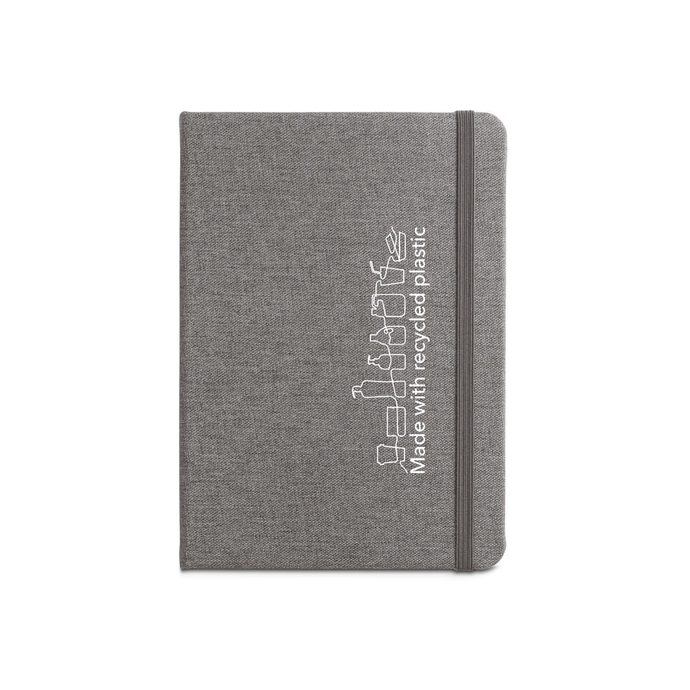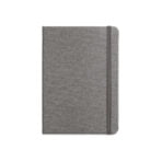 Caderno A5 de capa dura em tecido poliéster 100% reciclado (100% rPET). Com 96 folhas pautadas em papel cor marfim proveniente de gestão florestal sustentável, fita separadora, elástico e bolso em papel na parte traseira da capa. 140 x 210 mm