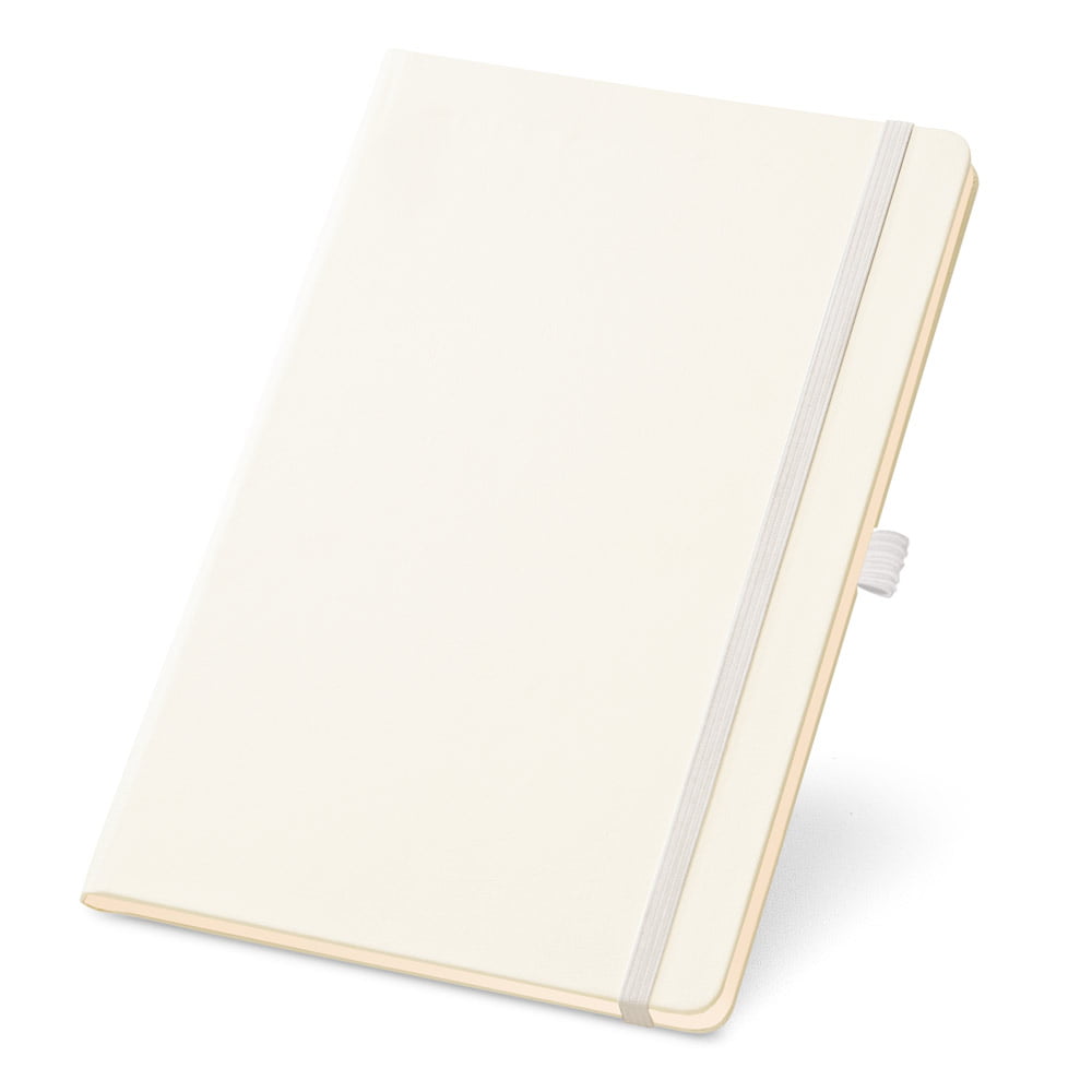 Caderno A5 de capa dura com 80 folhas pautadas em cor marfim. Contém suporte para esferográfica (não inclusa) e bolso interior. 137 x 210 mm