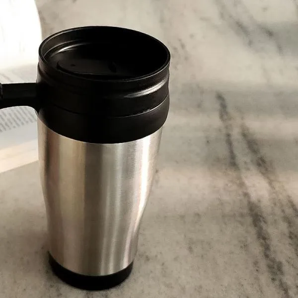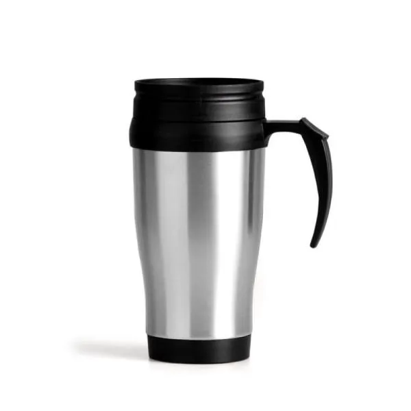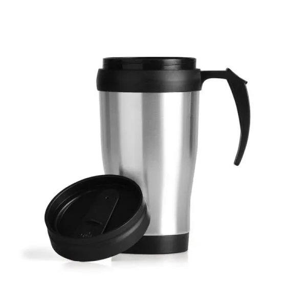 Caneca em polipropileno preto e revestida em aço inox escovado. Possui tampa rosqueável com trava de abertura e anel interno em silicone para vedação. Capacidade: 410 ml MATERIAL ATÓXICO - TESTADO E APROVADO..