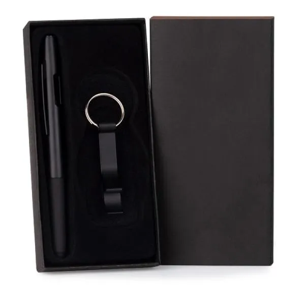 Conjunto de caneta e chaveiro em metal. Caneta esferográfica em ABS preta. Conta com tampa com abertura nas laterais, acabamento fosco, clipe em metal, ponteira touch em silicone preto e carga esferográfica azul. Chaveiro confeccionado em alumínio, possui as funções de abridor de garrafa e latinha.