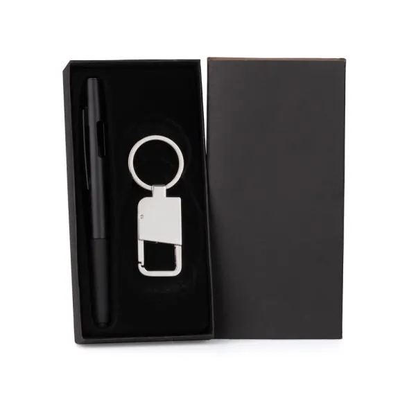 Caneta esferográfica em ABS preta e chaveiro em metal cromado com mosquetão.