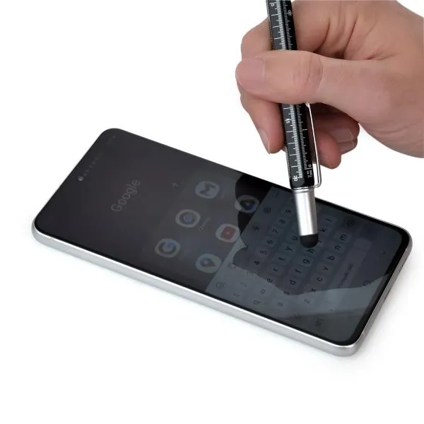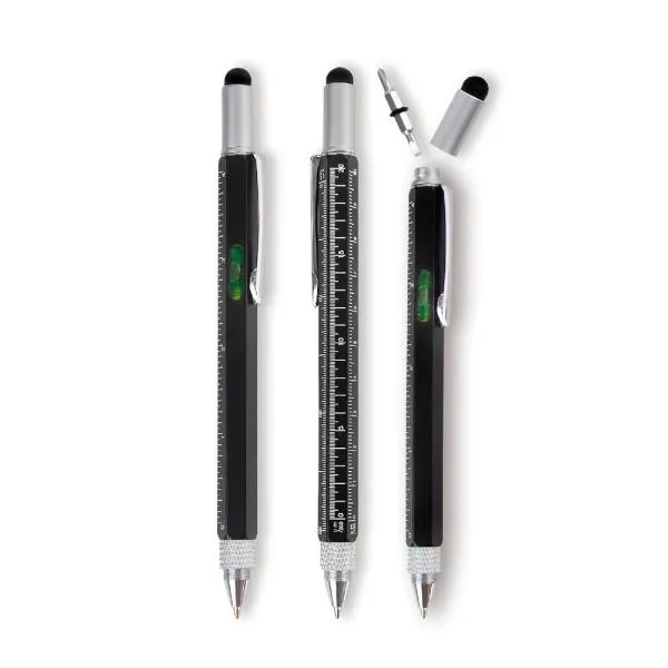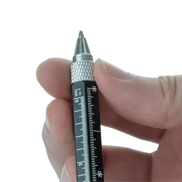 Caneta esferográfica 6x1 em alumínio preta. Conta com acabamento fosco, clipe e ponteira touch em silicone preto. 6x1 = esferográfica, nível, régua com 4 escalas (centimetro 1/100m, 1/200m, 1/300m e polegadas), ponta touch, fenda e philips. Carga esferográfica azul, acionada com um giro na ponta da caneta.