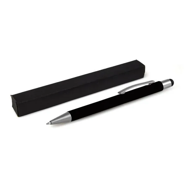 Caneta esferográfica em ABS verde com estojo plástico. Conta com tampa com abertura nas laterais, acabamento fosco, clipe em metal e ponteira touch em Silicone preto. Carga esferográfica azul. ESPECIFICAÇÕES TÉCNICAS