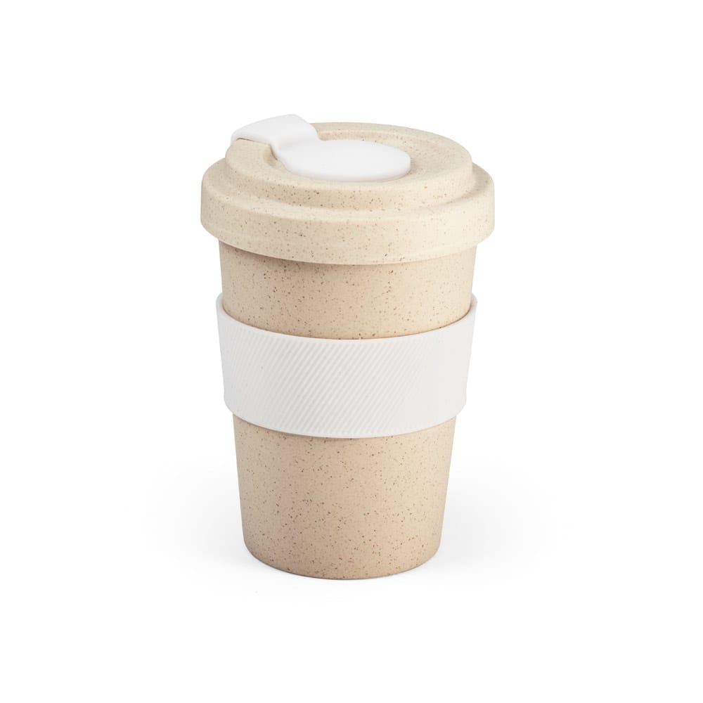 Copo de viagem em fibra de bambu (60%) e PP (40%) com tampa e capacidade até 500 mL. A tampa em silicone no topo roda para tapar abertura e prevenir salpicos. Tira de silicone no corpo para facilitar o transporte. Certificação EU Food Grade. ø95 x 140 mm
