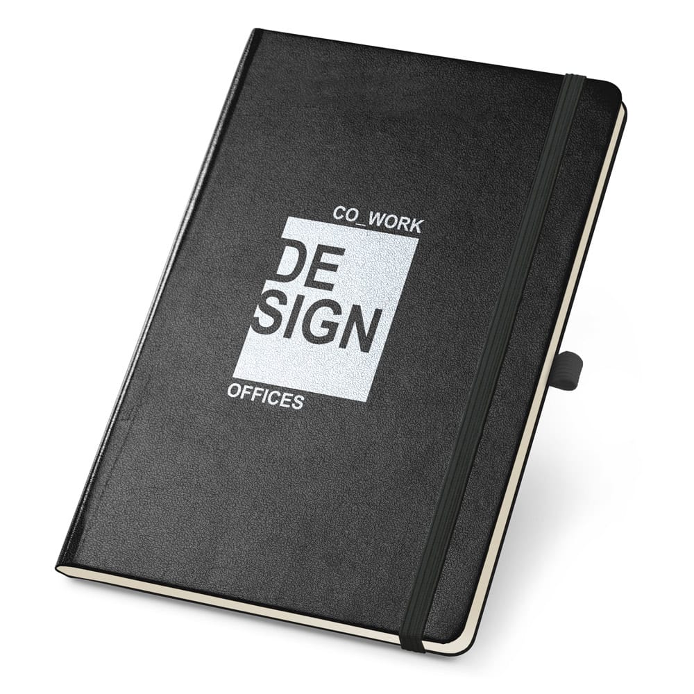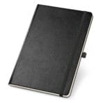 Caderno B6 de capa dura com 80 folhas lisas em cor marfim. Contém suporte para esferográfica (não inclusa) e bolso interior. 120 x 180 mm