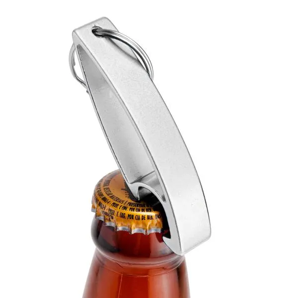 Chaveiro abridor de garrafas em alumínio prata com argola para fixação. ESPECIFICAÇÕES TÉCNICAS