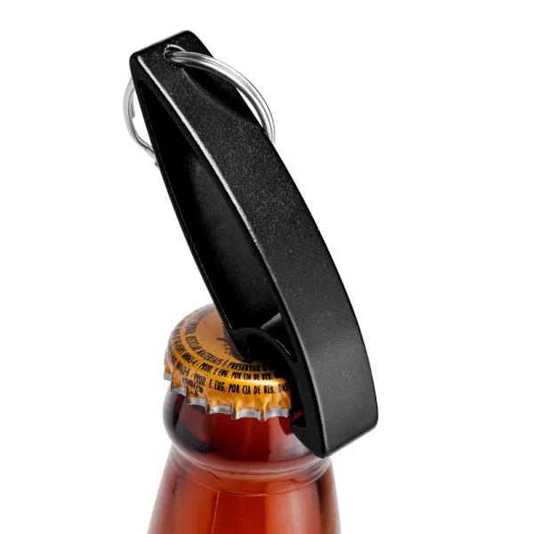 Chaveiro abridor de garrafas em alumínio preto com argola para fixação. ESPECIFICAÇÕES TÉCNICAS