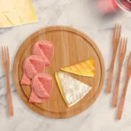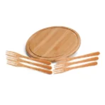 Conjunto composto por uma tábua redonda em tripla camada invertida de bambu, que proporciona maior durabilidade e resistência, com Ø 21cm e seis garfinhos para Petisco/Queijo também confeccionados em bambu.