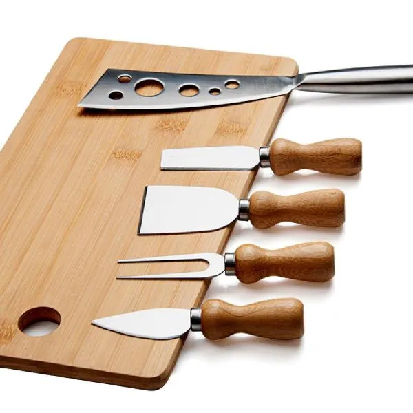 Conjunto para queijo em bambu/aço inox. Conta com tábua em bambu; Duas facas, sendo, uma com ponta e outra reta, garfo e espátula em madeira/inox; Faca para frios em metal. Acompanha embalagem kraft