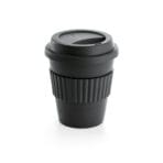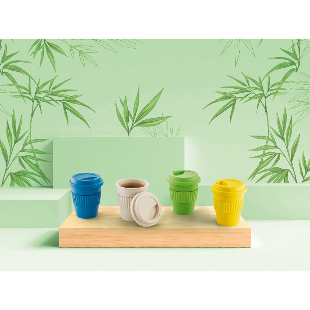 Copo de viagem em fibra de bambu (60%) e PP (40%), com tampa e capacidade até 380 mL. Tira em silicone para facilitar o transporte de bebidas quentes. Certificação EU Food Grade. ø95 x 114 mm