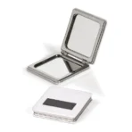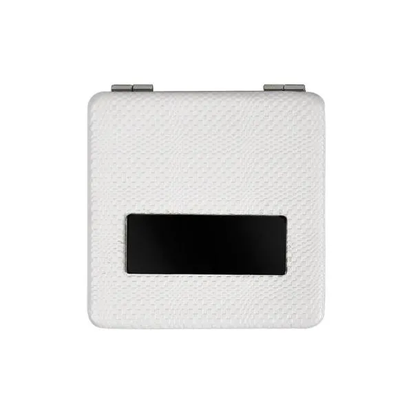 Conjunto de dois espelhos em estojo quadrado confeccionado em material sintético texturizado branco, com acabamento interno em metal cromado brilhante e detalhe frontal em metal ônix. Possui um lado interno que exibe o reflexo da imagem aumentada e o outro que exibe o reflexo da imagem no tamanho natural. Conta com um imã interno em uma das bordas que permite o fechamento mais prático. É ideal para carregar em bolsas ou necessaires.