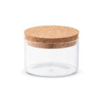 Frasco em vidro borossilicato com tampa de cortiça. Capacidade até 380ml. Fornecido em caixa presente de papel kraft reciclado. Certificação EU Food Grade. ø95 x 60 mm