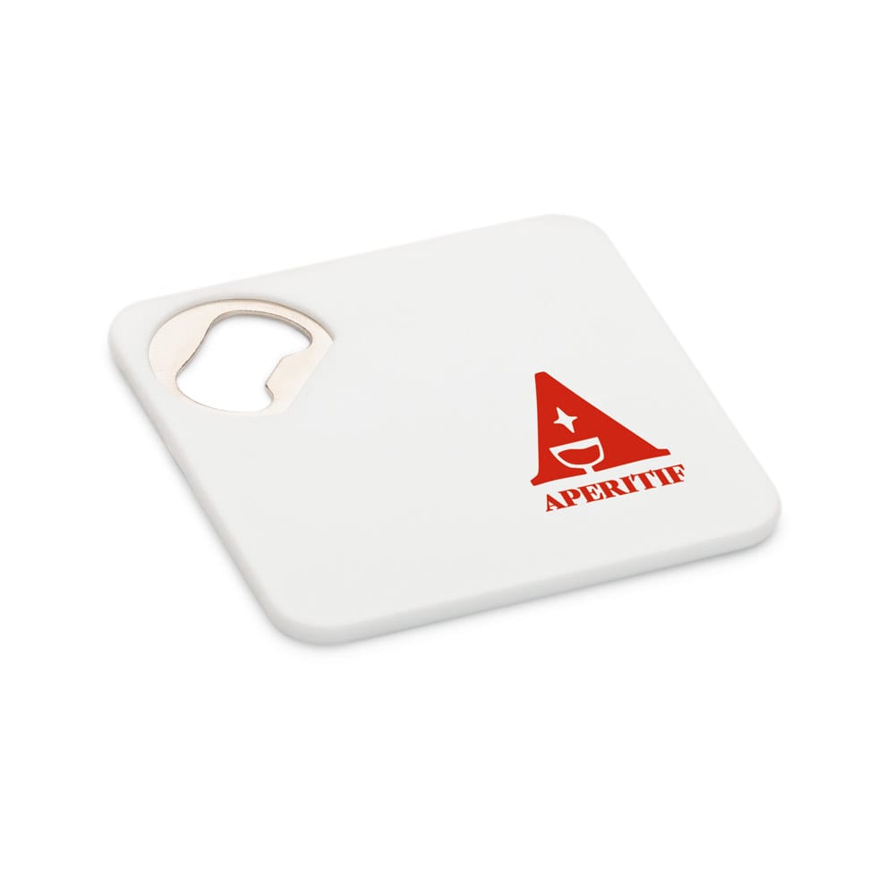 Porta copos em ABS com abridor de garrafas e esponja antiderrapante na base. 82 x 82 x 4 mm