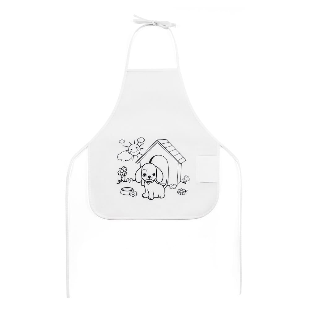 Avental de criança para colorir em non-woven (80 g/m²) com desenho impresso e bolso lateral. 6 gizes de cera inclusos. 380 x 430 mm