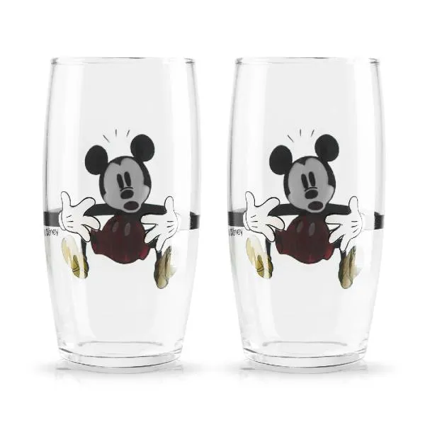 Jogo de copos personalizados contendo dois copos Mickey em vidro e embalagem.