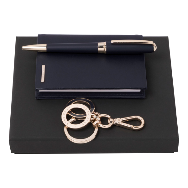 Kit bateria portátil, chaveiro e roller. Black. Coleção Edge. Capacidade: 5.000 mAh. Embalagem "Hugo Boss" inclusa (HBX500). Bateria: 120 x 67 x 12 mm | Chaveiro: 20 x 58 x 8 mm | Roller: ø13 x 139 mm | Caixa: 163 x 170 x 46 mm