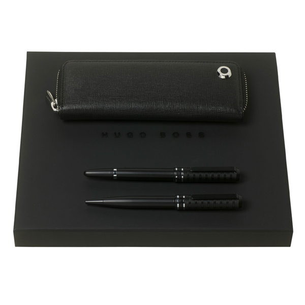 Kit caneta tinteiro, esferográfica e estojo. Estojo com zíper e capacidade para 2 esferográficas. Embalagem "Hugo Boss" inclusa (HBN500). Caneta tinteiro: ø13 x 139 mm | Esferográfica: ø13 x 138 mm | Estojo: 172 x 65 x 20 mm | Caixa: 217 x 247 x 30 mm