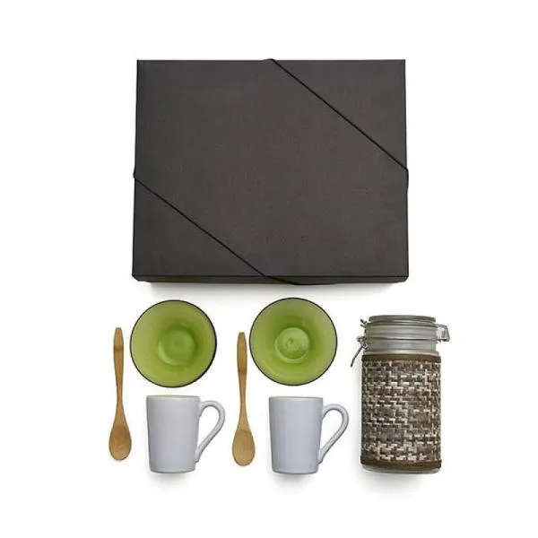 Conta com tábua em Bambu; Faca e garfo em Madeira/Inox; Caneca em vidro; Pasta para faca e garfo em papelão rígido.
