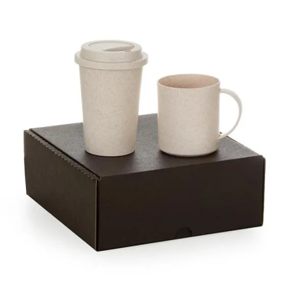 Kit caneca e copo. Conta com caneca e copo em fibra de bambu/PP. A caneca conta com alça para melhor uso e o copo com tampa e abertura para beber o líquido. ESPECIFICAÇÕES TÉCNICAS