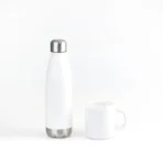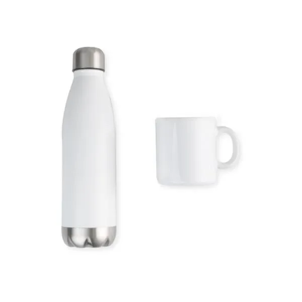 Kit garrafa e caneca. Conta com garrafa em aço inox branca com tampa rosqueável e caneca em cerâmica branca.