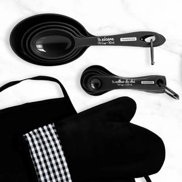 Kit para bolos contendo forma em alumínio antiaderente; Medidores em xícaras e colheres; Avental e luva térmica em Brim.