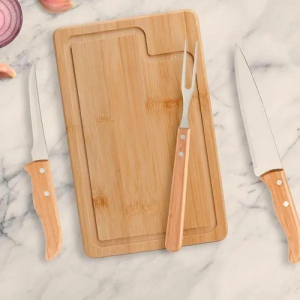 Conjunto composto por uma tábua retangular em tripla camada invertida de Bambu com sulco e três peças com cabos em Bambu e lâminas em aço inox com rebites resistentes, sendo uma faca 7”, uma faca 5” para desossar e um garfo trinchante. Produto ecológico.