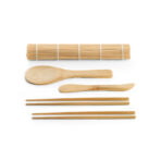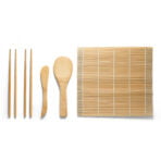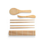 Kit para sushi em bambu com tapete, 2 pares de hashi, 1 colher e 1 faca em bambu. Fornecido em caixa presente de papel kraft reciclado. A cor e o resultado da impressão nos materiais naturais pode variar entre produtos. Caixa: 245 x 100 x 33 mm