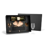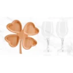 Kit para petisco e vinho. Conta com petisqueira em formato de trevo em bambu; Duas taças para vinho em vidro; Espaço para garrafa com palha (NÃO ACOMPANHA GARRAFA). Estão perfeitamente acomodados em uma caixa para presentear.